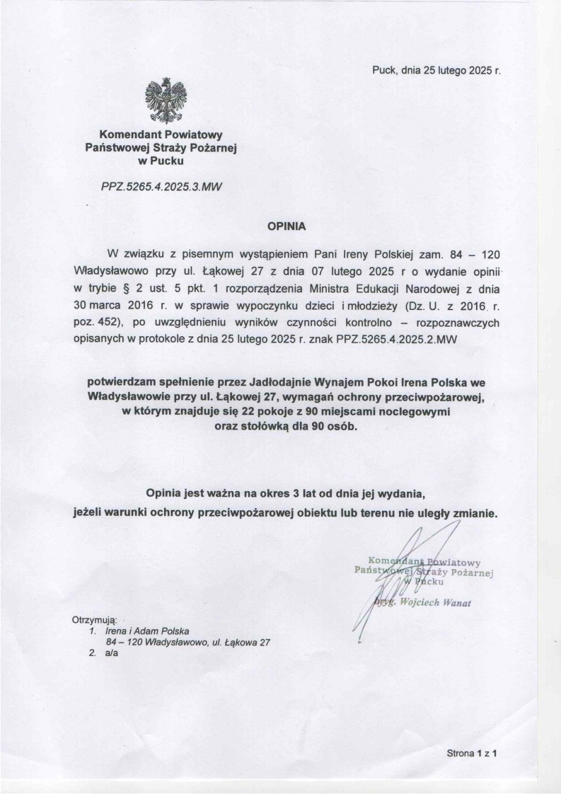 - Nasze pokoje gościnne posiadają wymagane kwalifikacje, wydane przez straż pożarną, sanepid.